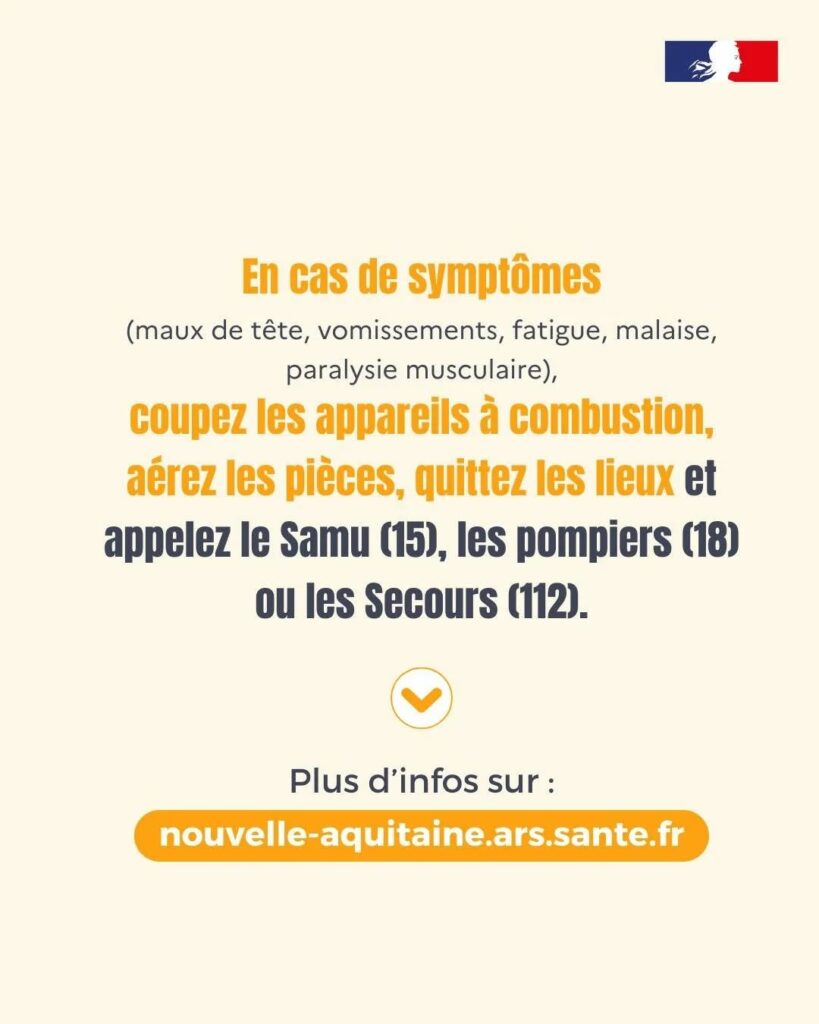 => En cas de symptômes (maux de tête, vomissements, fatigue, malaise, paralysie musculaire) : aérez la pièce, quittez les lieux et appelez le 15, le 17 ou le 18.